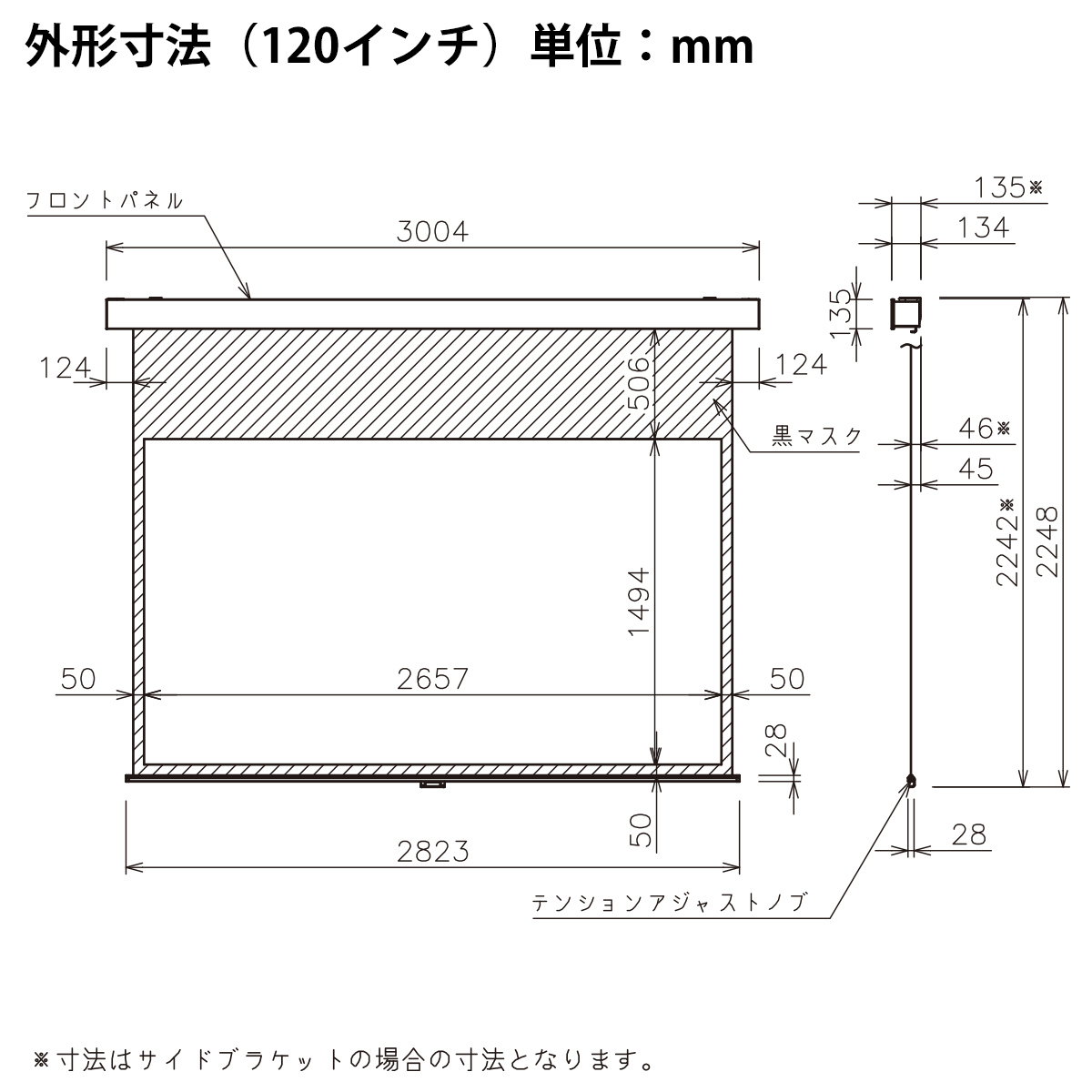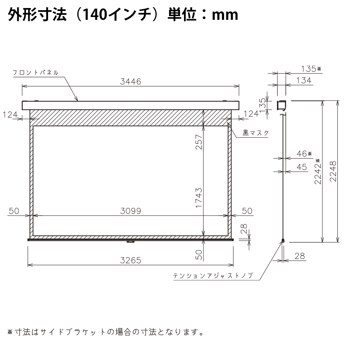 ※全高と収納時高の上段はスライディングブラケット使用時、下段はサイドブラケット使用時の寸法です。